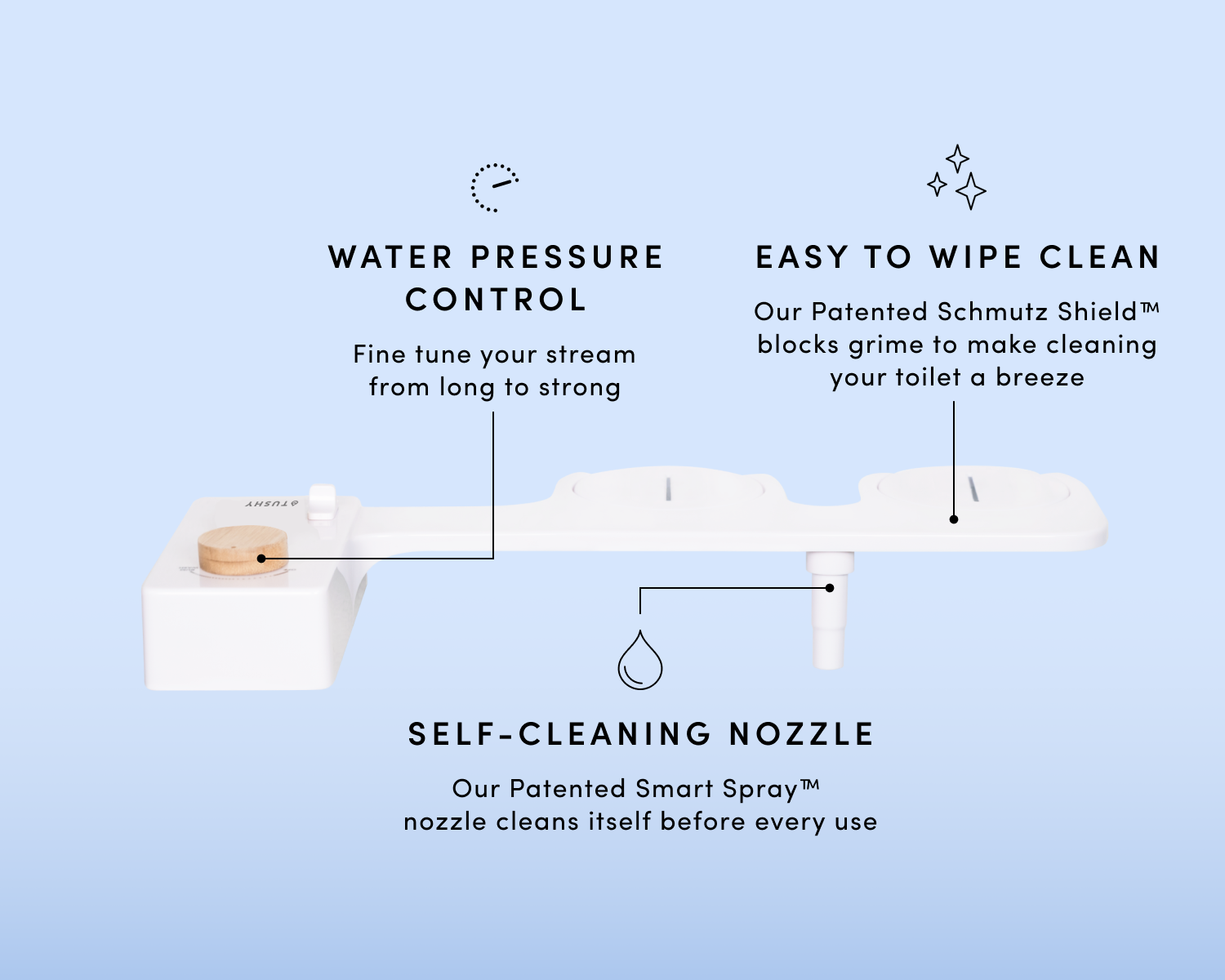 The TUSHY Spa keeps you clean by using warm and cool water to soothe your bum while also cleaning it the same way your sink or shower would. If you got poop on you, would you wipe it off with dry paper? No silly! You'd wash it off. So, why would you treat your butt any different?