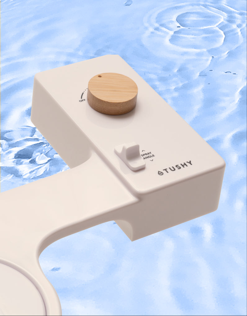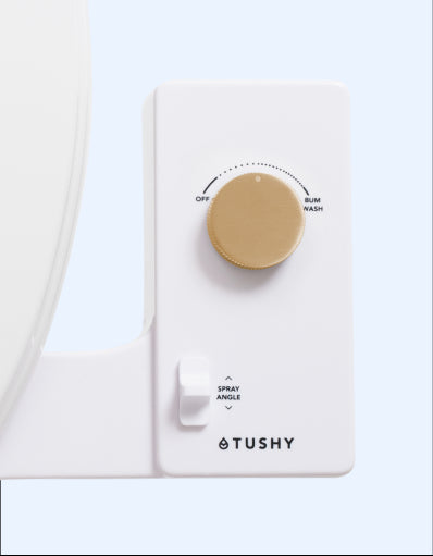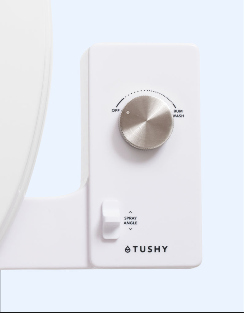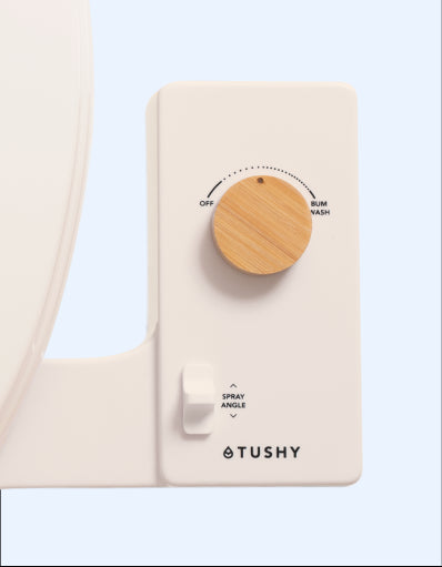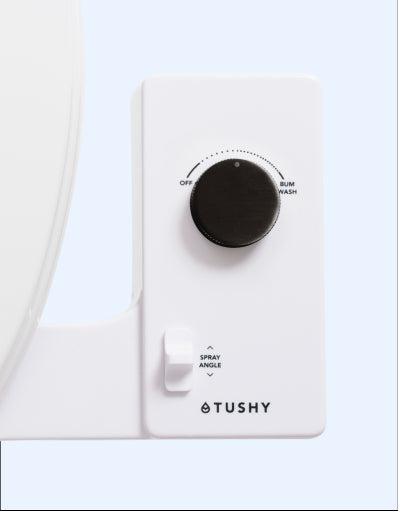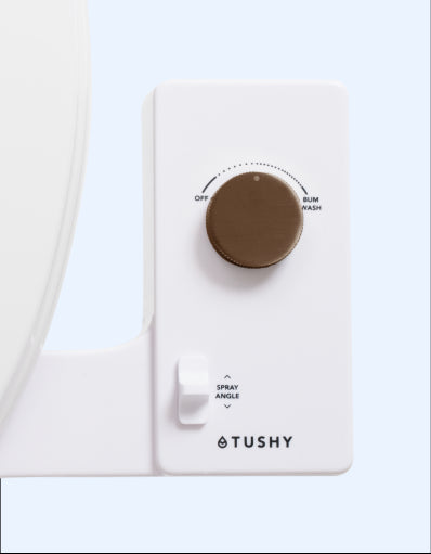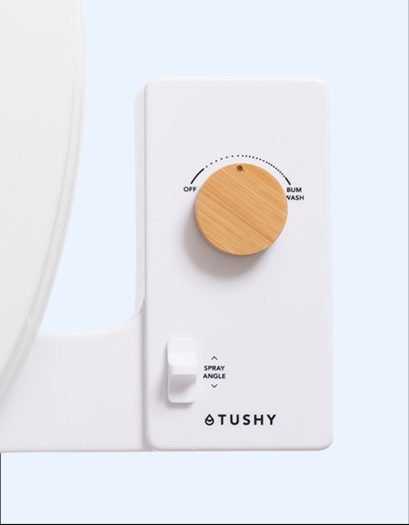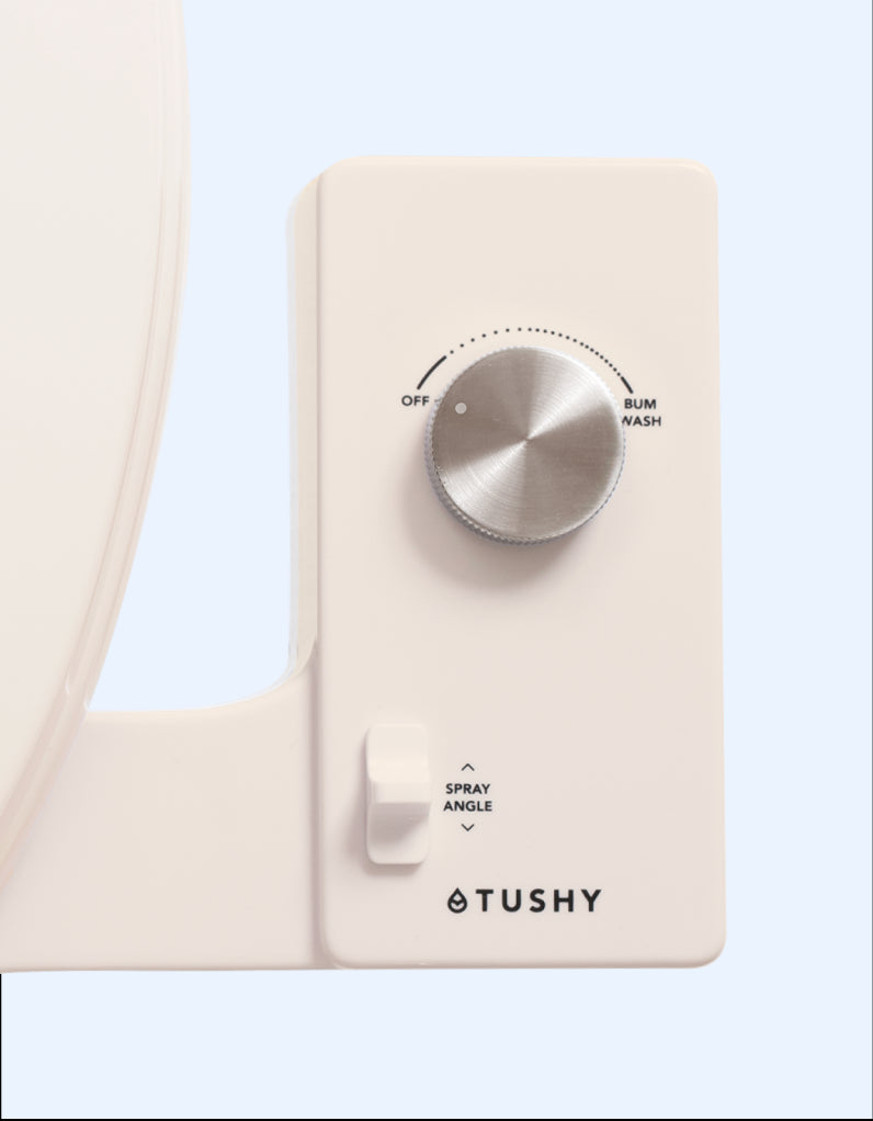 Sit, poop, spray, pat dry. Turn the dial on your TUSHY control panel to activate the bidet nozzle after you plop. Fresh, pressurized water will spray your b-hole clean. Let it flow for a few seconds before patting your booty dry with a few squares of bamboo TP!