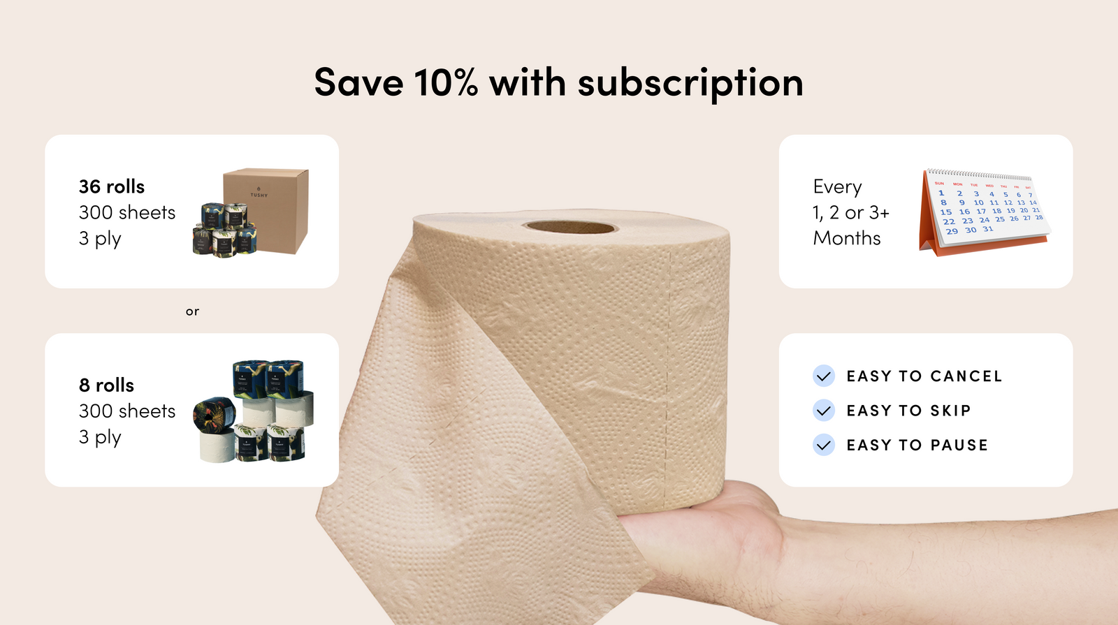 One roll of our Bamboo TP takes just 0.59 gallons of water to make. While one roll of conventional TP takes 37 gallons of water! Not only are trees and water spared from being used to wipe our cracks, but bamboo toilet paper manufacturing releases 30% fewer greenhouse gas emissions than its hardwood counterpart.